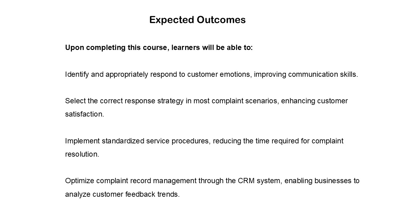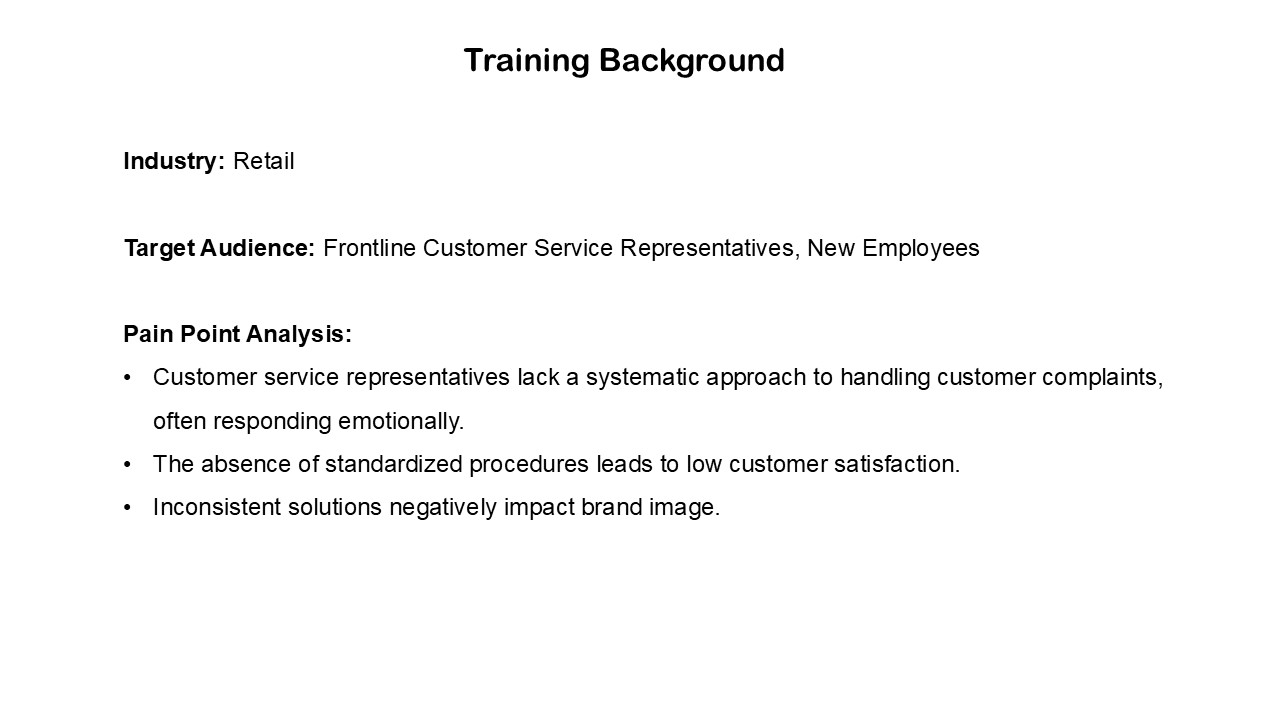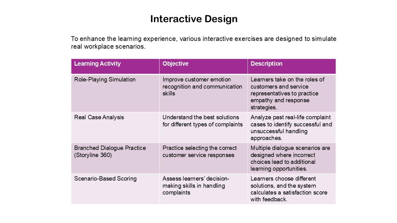 This action map is designed for customer service representatives in the retail industry, with the goal of enhancing complaint handling skills. Through goal setting, breaking down key actions, structuring the course, and incorporating interactive learning solutions, I have developed a comprehensive training program that ensures learners can efficiently apply what they have learned, improving customer satisfaction and optimizing service quality. This demonstrates my goal-oriented and practical approach to training planning.